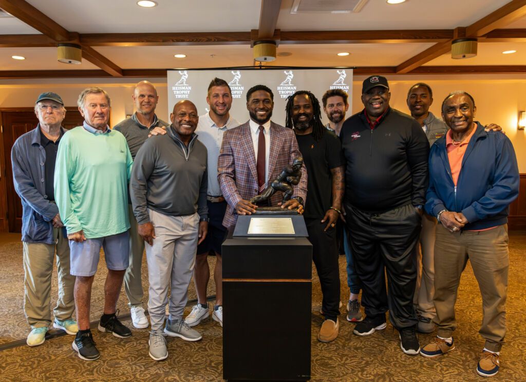 Heisman winners on hand for Reggie Bush’s trophy reinstatement, from left to the right, include Gary Beban, Steve Spurrier, Danny Wuerffel, Archie Griffin, Tim Tebow, Reggie Bush, Ricky Williams, Eric Crouch, George Rogers, Charlie Ward and Johnny Rodgers.