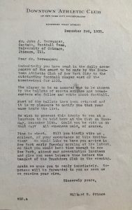 First up, the original letter from Downtown Athletic Club President Willard B. Prince, inviting Jay Berwanger of the University of Chicago to New York City to accept this new award for the “best player East of the Mississippi.”